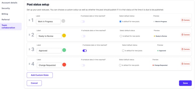 From here you can edit the labels (status names), colors for quick visual cues, and add/remove statuses to meet the unique needs of your team. You can have as few or as many as you'd like.