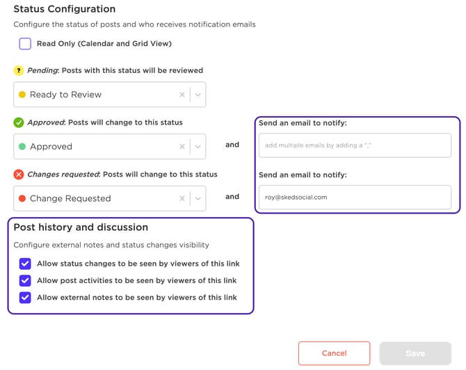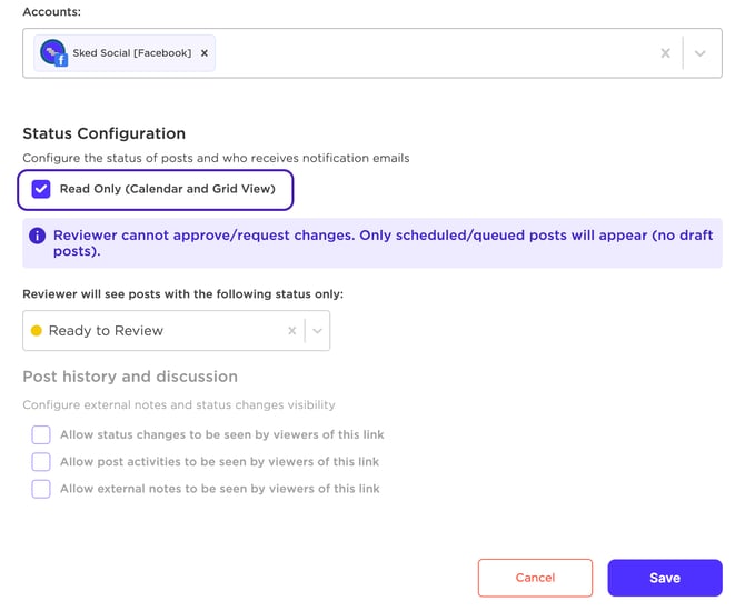 If you'd like to share content with a client that doesn't require approval, you can use our permanent shared calendar option to easily showcase what's upcoming in a calendar or feed view. This option can be enabled while creating/editing your external review link by selecting the Read Only option.