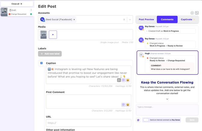 Reviewers can refer back to the calendar whenever they need a refresher on what's coming up on their social. If a reviewer requests changes on a post and leaves feedback in the chat box, you'll see that feedback in your Sked Dash, inside the post.
