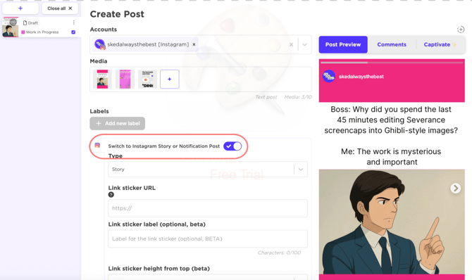 To create a story chain in Sked, click on the "Create Post" button and make sure you select an Instagram account only, as story posting is currently supported for Instagram only.