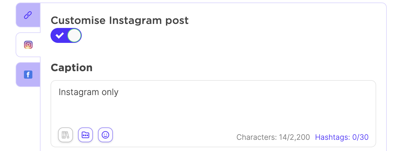 To use a different caption on each platform, click the specific platform and toggle the "Customize (platform name) post" option, then enter your desired platform specific text.