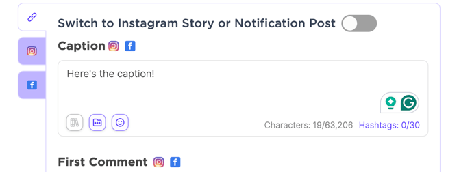 To post the same caption (or have parts of the same caption) across multiple channels, enter your text into the linked caption box. This caption will go out to all platforms you've added to the post.