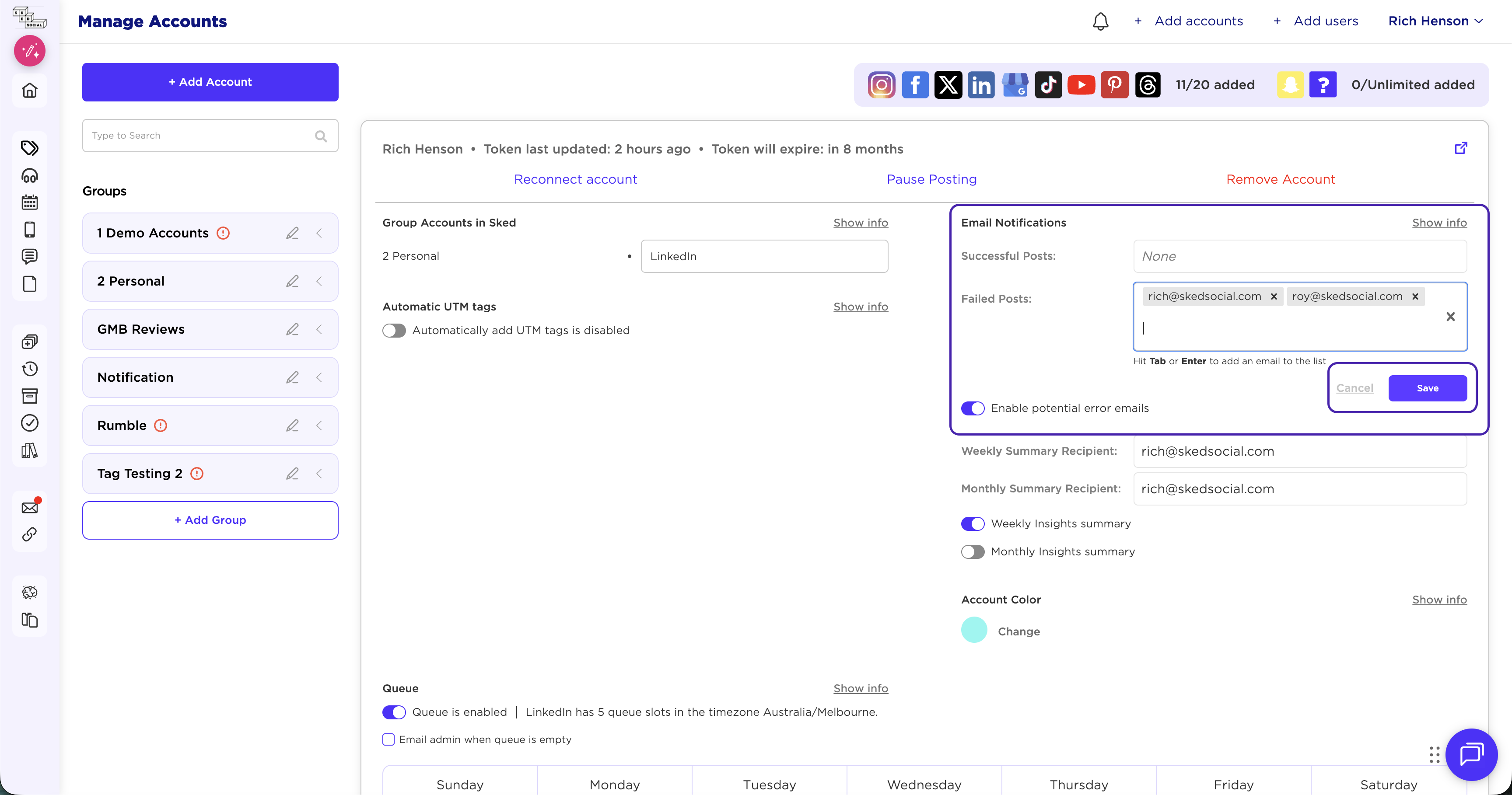Here you can also add email addresses for failed posts, potential error emails and emails for when your queue is empty.