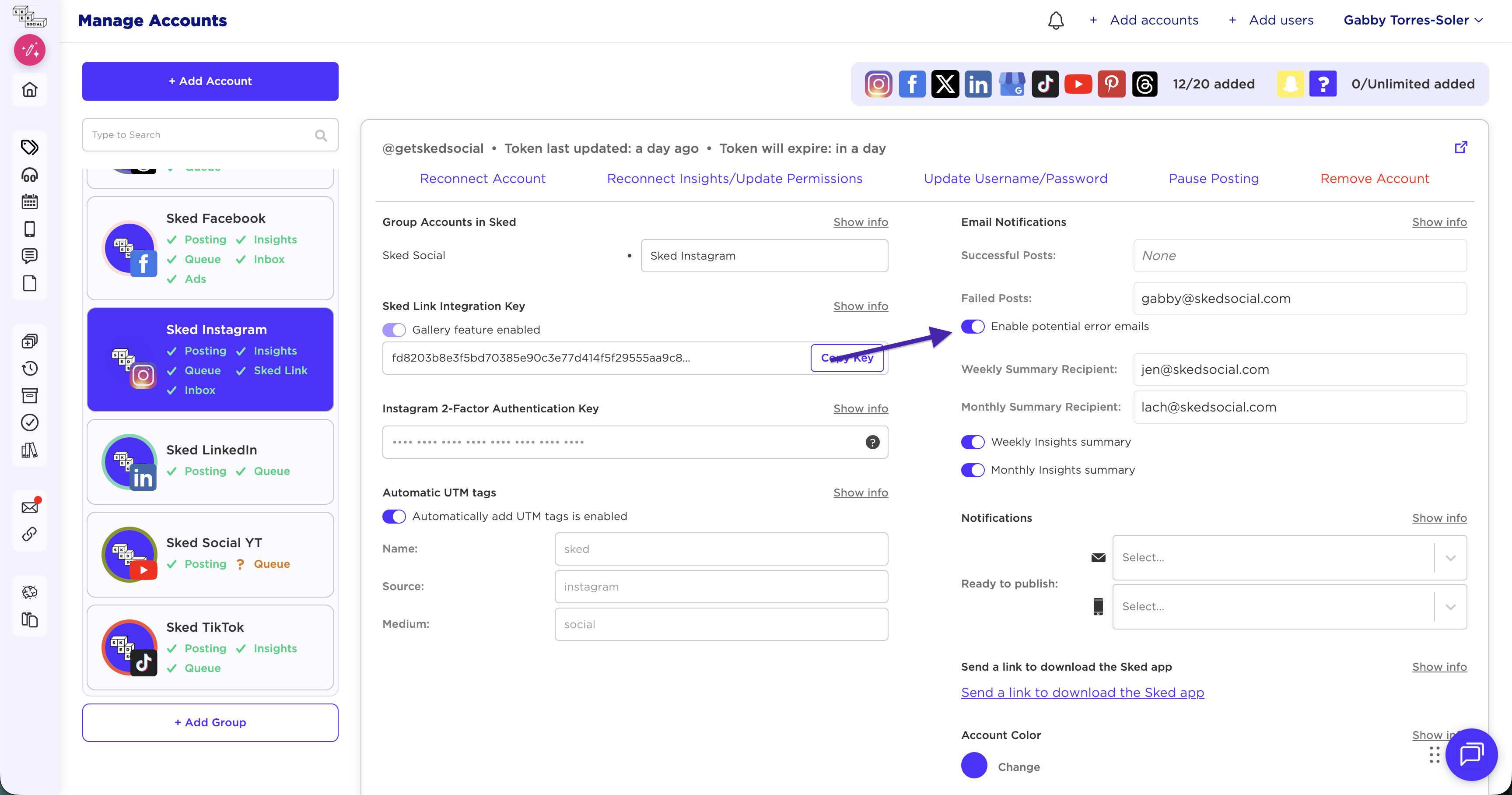 When this occurs, we send an email to people specified to receive error emails (if you haven't set anyone, this will be the Sked administrator - but you can define who should receive error emails for each of your Instagram accounts in manage accounts > email notifications with more information. If "send potential error emails" is off, then we won't send potential error emails obviously, so check that the setting is enabled as well